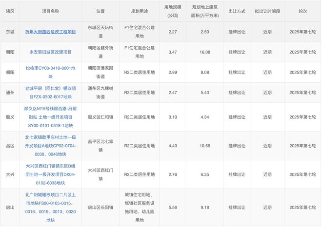 北京于9月3日在沉Xu di的北京,北京市政规划和自然资源委员会的网站在2025年发布了第七个计划供应圈的土地商业居住地列表,共有8个土地,土地约为27公顷,约有27公顷,大约630,000平方平方英尺的建设规模。计划在不久的将来给予。该列表的第六名列表在一个月内发布,有5个地块,而Haidian Xijiao机场只有2个地块未能进入市场。其他三个案件在9月5日和9月30日正式列出并拍卖。在第七轮中启动的所有地块都可以在火车运输站周围的地区找到,其剩余需求对市场以及相对完整的基础设施和公共服务服务。从区域分配的角度来看,主要地区(Dongcheng区)的Mayroong 1个案件,中央城市地区(Chaoyang区)的2个案件,5个病例IN子中心和Pingyuan多点区域(1例在Tongzhou区,Shunyi区,Changping District,Daxing District和Fangshan区)。详细信息如下:1。北尚区的西危险改革项目,东宁街道路,东京区,有F1混合公共建筑占据了2.27公顷的面积,计划建筑面积为25,000平方米。根据先前发布的计划,住宅建筑物为17,500平方米,公共建筑物为7,500平方米,建筑物的高度为3.3-18米。该地块位于东京区的Tiantan Street,第二条道路的位于第7行的Qiaowan站附近,第5行和第7行的Ciqikou车站和第7行转移站,带有椰子运输。有北京医院,汤里医院,北京友谊医院,天堂公园,库鲁伊购物中心,新世界百货商店NG中心等,他们的生活设施已经成熟。 2。Yong'anli旧城市翻新项目Yong'anli旧城市翻新项目覆盖了3.47公顷的面积,计划建筑面积为160,800平方米。它位于Chaoyang区的Jianwai Street,位于东三环路和Changan Street的南部,在Metro 1号线附近和Yong'anli站,正在建设中的运动站。周边地区包括丽塔公园,资本儿科研究所,吉马购物中心,世界贸易中心蒂安吉,吉尤建筑物,固定购物中心等,生活设施是成人。 3。CHAOYANG区的CY00-0410-0001 Songyuli地块,面积为2.89公顷,计划建筑面积为80,800平方米。位于Chaoyang区的Panjiayan Street,位于第三圈路和第四圈路之间,靠近北京大学第14号大学的西门站。被北京包围Chaoyang Heshenhui,Yansha Outlets,Fangyuanli ID购物中心,北京广场,包括传统的中国和西方医学医院公园,等等。4。公顷,计划面积为54,300平方米。位于Tongzhou区的Jiukeshu Street,位于第五环路和第六圈路之间,靠近地铁线的Jiukeshu站。北京汤茂(Beijing Tongzhou)环绕着北京传统中药大学东医学大学医院,汤佐·尤恩(Tongzhou Yunjing Park)等。位于Renhe Town,Shunyi区,第六圈路以外,Shimen Station附近Metro第15号线。由Cathay Hongcheng购物广场,Longhua出口广场,Jangan商业机构,例如Huigang,Huigang,Beijing Jingshun医院,Wangquan Park等。6。6。覆盖4.4公顷区域的地块,计划建筑面积为105,600平方米。在第五和Iyou之间,位于Changping区的Beqijia镇也是相同的道路,毗邻Metro Line 17号线和正在建设的第18号线Tiastyuan East Station的转移站。周围有国泰分商店,温尤公园,青还国乡村公园,台湾传统中药医院等,居住设施非常完整。 7. B组在东区的第一级土地开发项目,Xihongmen Town,daxing District,Xihongmen 6038 Xihongmen 6038地块占地2.76公顷,带有PLANNEND建筑区为63,500平方米。它位于第五和第六圈道之间的达克森区的Xihongmen镇,位于计划中的地铁第19阶段的第二阶段的Xihongmen东站。非常完整。 8。在Fangshan区的Beiguangyang City Shantytown Renovation项目中,FS00-0105-0015、0016、0019、0013和0020的列表图占地5.56公顷,面积为5.56公顷,计划建筑面积为91,800平方英尺。位于Fangshan区的Chanang Town,位于第五环路和第六圈路之间,位于地铁Fangshan Line的Guangyangcheng站附近。被北京的Fangshan Xiyue Tianjie包围
