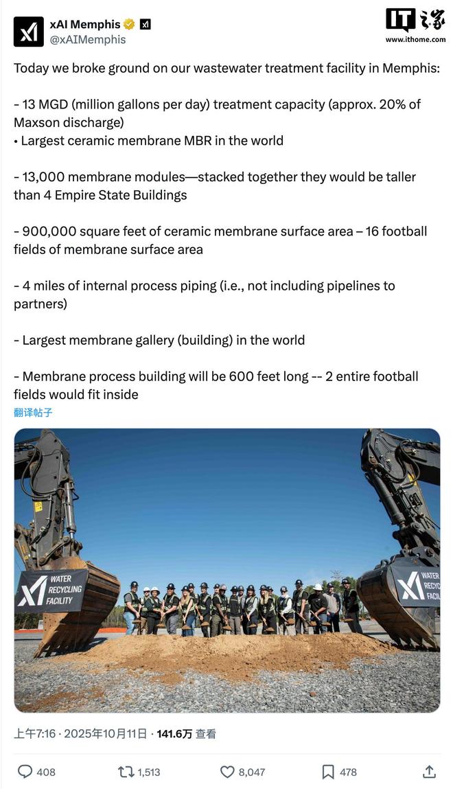 Musk Xai 污水处理厂破土动工,每年为孟菲斯节省近 190 亿升水