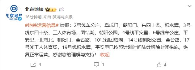 According to @Beijing Metro: Metro Line 2 Xizhimen, Beijing Station, Dongzhimen, Andingmen, Tamuu Street, Yonghegong, Chegongzhuang, Fuchengmen, Chaoyangmen, Dong42, Jishuitan, Line 4 Xizhimen, Line 7 Zhushikou, Line 3 East Finding, Workers' Stadium, Tuanjie, Tuanjie, Chaoyang Park, Line 4 Ping'anli, Line 6 Chegongzhuang, Ping'anli, Beihai North, Chaoyangmen, Jintai Road, Line 10 Tuanjie Lake, Line 14 Chaoyang Park, Jintai Road, Line 17 Workers' Stadium, Line 19 Jishititan and Ping'anli have success Planned time and resumed normal operations.资料来源:@beijing地铁编辑:晒黑