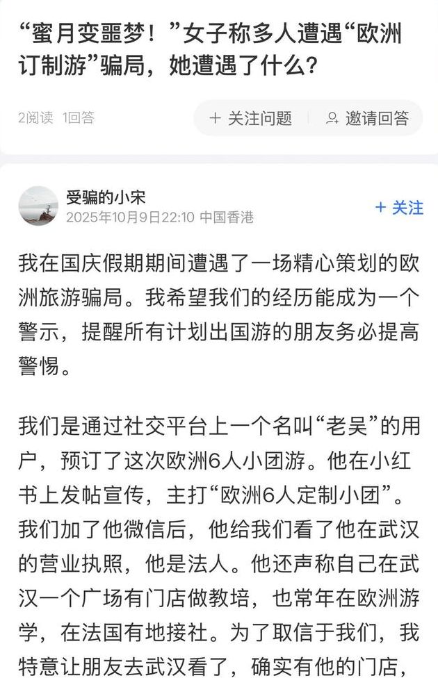 “因为合同里什么都有,而且我们的visa卡限额不高,所以只带了一两百欧元现金,打车不太方便,而且拖着很多大行李箱也太重了。”来自广东的宋女士对记者说,他和妻子原本盼着国庆去欧洲度蜜月,但最终还是破裂了。 10月9日,宋女士在社交平台上称,他之前联系的小红书一家旅行社在他和妻子抵达欧洲后失去了联系。 ▲ 女士这首歌在社交平台上流传。宋女士向潇湘晨报记者表示,他在小红书看到了这家旅行社(当时定义为老吴)的广告,于是私信联系了该账号,而且因为APOS是老吴微信添加的。 “我从3月份开始整理行程,一共付了3万元。”女士说这首歌是她和丈夫的蜜月之旅。之前定好的行程该旅行社完成的行程包括意大利罗马、法国巴黎等几个欧洲景点。 ▲根据宋女士和旅行社原来签订的协议,9月30日宋女士到罗马后,老吴会安排当地导游接她们,并在罗马住一晚。第二天,即10月1日,他们将从罗马飞往巴黎,与老吴会合,完成余下的旅程。但9月30日宋女士夫妇抵达罗马后,老吴只是在Uber叫了车,并没有之前承诺的地面接机人员。司宋女士和两人自费购买了10月1日从罗马飞往巴黎的机票。到达巴黎后,老吴一直无法联系上。小姐发来消息。宋又打了好几次电话。最后,老吴告诉宋女士,由于他的车辆只有在法国和意大利运营的资格,所以从瑞士到法国巴黎,他被限制在瑞士海关。他无法在 10 月 1 日修复这些问题,并要求他们让自己。 ▲ 老吴向群里声称自己被瑞士海关检查了。这时,宋女士得知老吴第二天处理完物品后会联系他们。但接下来的几天,即使他打电话、发信息,也没有和老吴联系。这次旅行原本是确定要一路同行的,所以他和妻子并没有做太多的技巧和准备。 “因为这是我第一次出国,而且我的英语不是很好,我只是想找个全包套餐舒服点,没能做太多事情。我只带了一张visa卡,限额不高,只带了100或200欧元的现金。”此时,由于无法提前下载当地的出租车应用程序,加上行李很多,我无法充分享受旅行的乐趣。旅程。另外,当天是国庆节,当地酒店价格也不便宜。不是用旅行团付的3万元,女士和她丈夫在欧洲停留的10天也花了4万元。我当天就在酒店决定。价格很贵,太便宜的话我会记得不安全。 “因为不知道老吴为什么不联系我,所以宋女士还是希望老吴能把东西握在手里,然后继续行程。▲宋女士自费购买了从罗马到巴黎的机票。与“法国地面机构”一直呼吁的“法国人已经去大使馆打乌兰了”相反。使馆告诉他们,由于他们签的是国内合同,用国内账户支付人民币,建议他们回国后提起诉讼。宋女士对记者表示,回国后将走法律程序维护自己的权益。他希望退还之前支付的路费,但也要求一个解释。女士认为这首歌是他的婚礼蜜月之旅,其意义不同于平凡的旅程。同时,他希望提醒其他想要出国旅游的朋友,如有需要,请擦亮眼睛,不要上当受骗。宋女士认为,老吴确实不是通过瑞士海关失去联系,而是躲到了某个地方。因为此前多方与老吴接触时,法国旅游协会一位负责人表示,老吴9月30日正在米兰一家华人开的汽车修理店安排车辆,租用的车辆来自匈牙利。 ▲9月30日,老吴在米兰一家华人开的汽车修理店里。 10月13日,潇湘晨报记者联系上老吴的导游。老吴告诉记者,情况并非宋女士所想。 “9月28日我的车辆被刷到米兰,我的所有物品都被盗了。我的所有证件以及该团伙的6000多欧元的钱都被盗了。”老吴告诉记者,他的证件被盗了。意大利米兰,10月1日越过瑞士边境前往巴黎时被限制入境,因未证明身份且因车辆操作出现问题,被收取5000瑞士法郎(折合人民币约44692.51元)的罚款,他本人则限制海关边境两天。 ▲ 老吴的车被带到意大利米兰。老吴被释放后,立即筹集资金缴纳罚款,因此宋女士一行人第一次没有得到妥善的修复。 “手机被海关限制了,所以我在接电话前给他(宋女士)发了一条信息,告诉她情况,当时我就道歉了。”老吴告诉记者,当时他处理手头上的事情,已经是六点了。这时,他发现宋女士不仅在国内社交媒体上发布了有关他“跑钱”、“诈骗”的信息,还接受了多家媒体的采访。老吴认为,大多数人如果结合上下文考虑,他就相信女士的话。歌曲。 “全城都闹腾了,家人朋友都来问我怎么了,这个时候我的心情就是把钱还了,不想跟他有任何交流。”老吴解释说,这几天他没有联系宋女士,是因为他觉得宋女士不合适。他告诉记者,他曾承诺归还这笔钱,但由于资金困难,他无法立即转账,但承诺在10月份归还所有钱。 ▲10月10日,老吴联系宋女士道歉并退款。老吴在采访中对记者表示,对于这起事件他感到非常抱歉。这影响了宋女士的pTravel,但他也是受害者。穿越瑞士海 关某控制后,告诉宋女士自己无法保护自己,所以先询问了宋女士。宋先把自己的行程定下来。 “当我必须道歉时我会道歉。我会付出代价如果我必须付款,我会退还费用。但这是同一件事。至于破坏我的名誉,我也咨询了律师,以维护我的权益。”老吴在采访中告诉记者,他所在的旅行社受到了很大的影响,因此后续团开始申请退款。对于这一说法,宋女士表示,老吴并没有明确表示希望将钱退还给1日,也没有发布明确的道歉。也没有联系她,老吴被控制后,直到10月10日才补充道。 女士的微信公众号。宋先生通过另一个微信账号表达歉意并退款。司宋女士回国后会报警。老